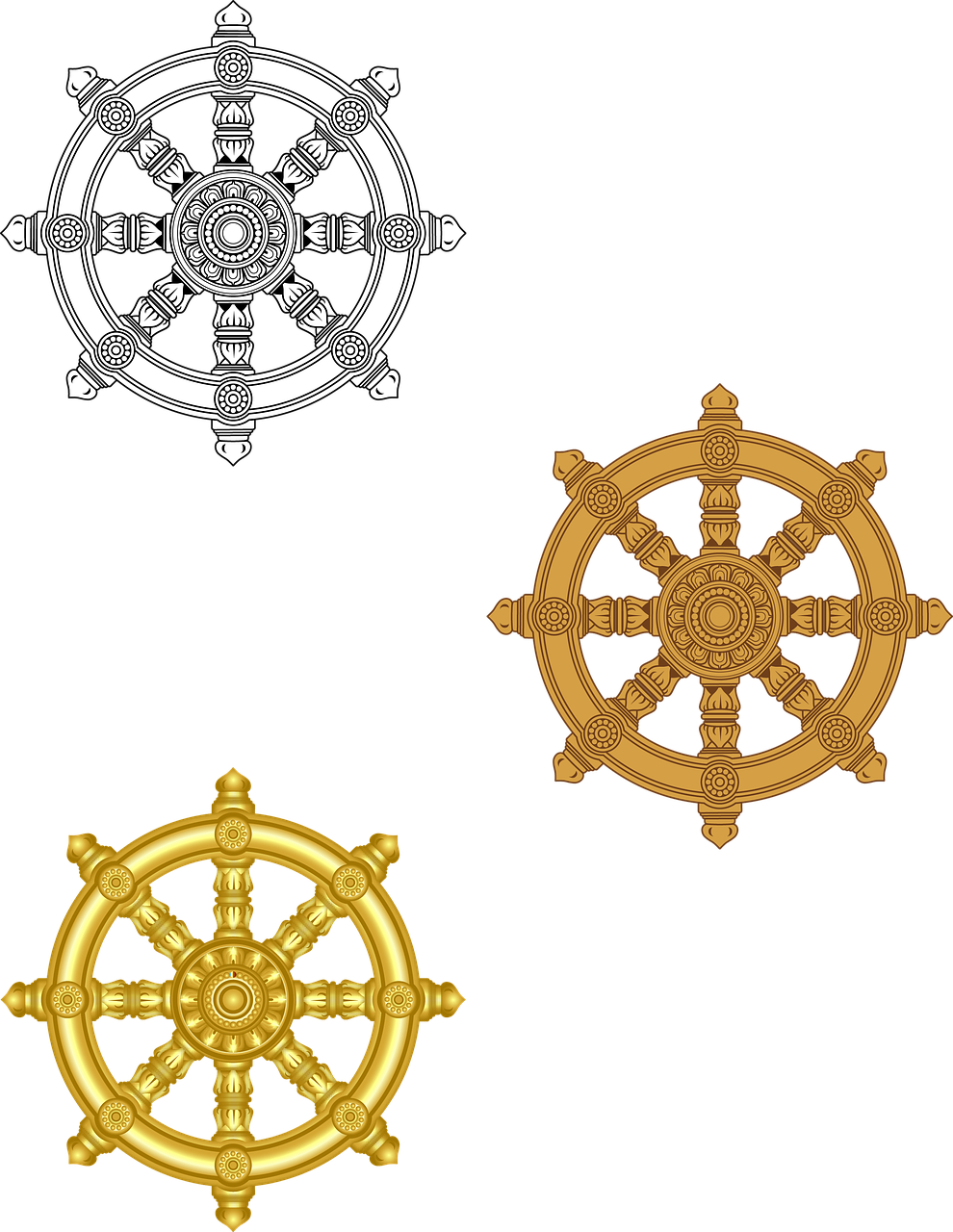 법륜(法輪)은 '진리의 바퀴'를 의미합니다. 부처님이 처음으로 설법을 시작했을 때 진리의 바퀴를 굴렸다고 하여, 부처님의 가르침과 깨달음의 전파를 상징합니다. 보통 8개의 바퀴살로 이루어져 있어 불교의 8정도를 나타내기도 합니다.